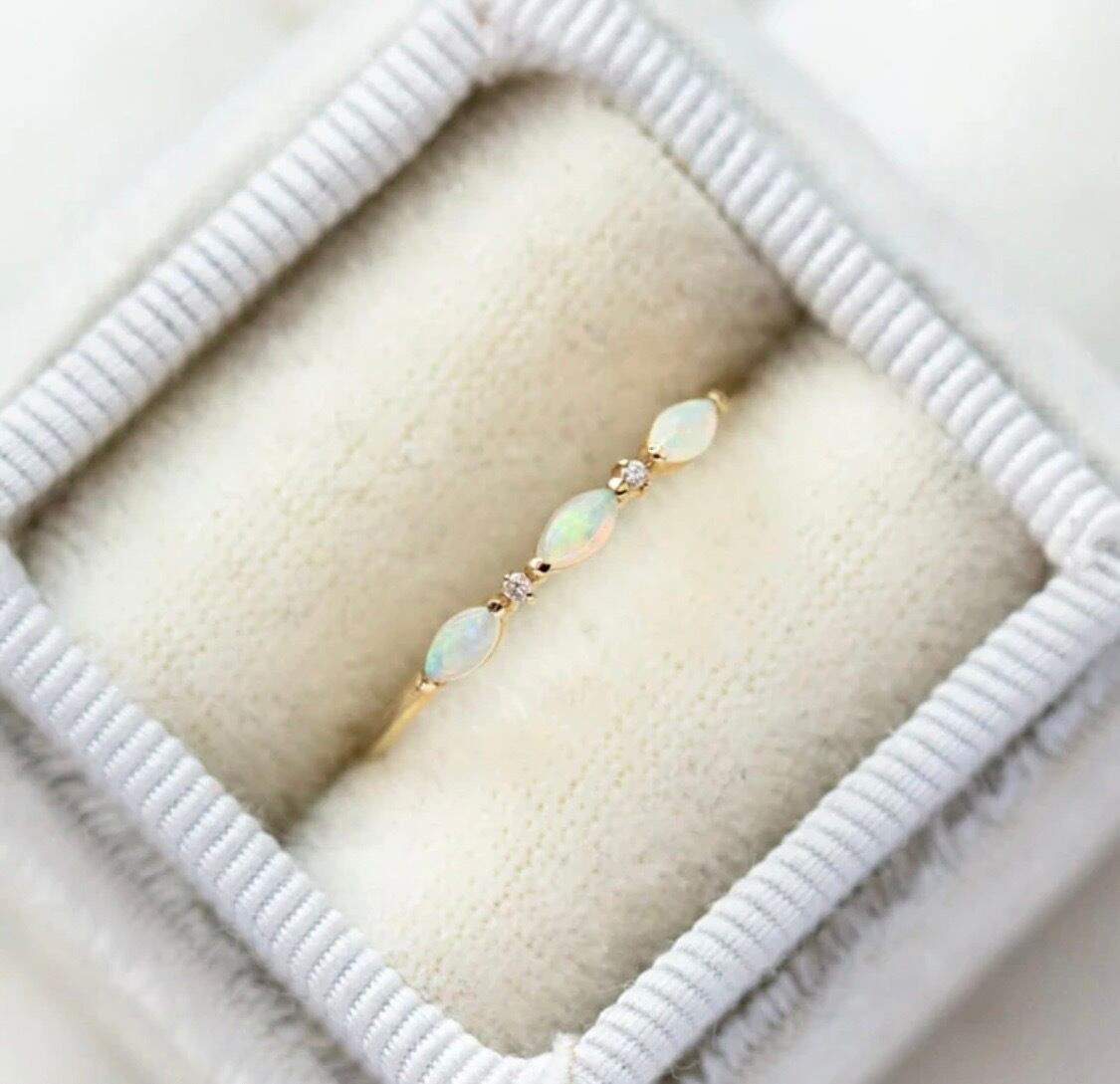 上品なオパールのリング。指に沿うような、なめらかでしなやかな着け心地にこだわっています。優しい色味と相まってより女性らしさを引き立てます。「オパール」創造性を高め、内面の隠れた才能を引き出す力に優れているといわれています。